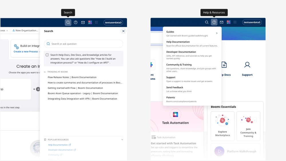 • Integrated search: Quickly get answers across Boomi Help Docs, Dev Docs, and Community resources, all without leaving the platform.