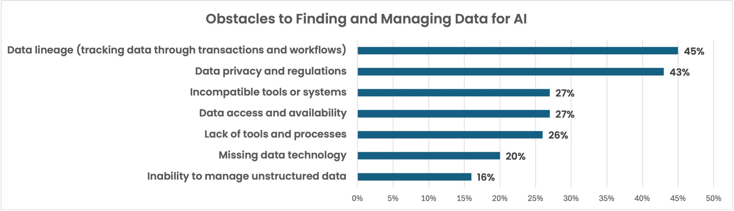 Companies face other challenges to data readiness, as well. In the BARC survey, companies identified these obstacles to finding and managing data for AI: